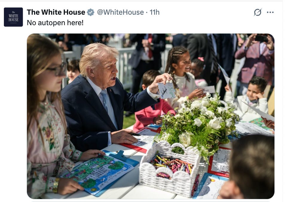 ….and also before the White House Easter egg event. Signing artwork drawn by children in the spring sunshine, Trump told the kids “Biden would use the autopen. He was incapable of signing his name, so they’d follow him around with this big machine. You know what it was called? An autopen!” Manna from heaven fo the White House social media team, which politicises everything…….