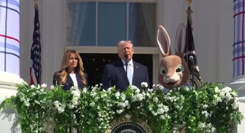 Imagine telling someone in 2015 that a golden escalator would be the portal into a strange new world where, a decade or so later, Donald Trump would end up making proclamations about a new Middle East war with a cross-eyed Easter bunny stood alongside. That it the world we now inhabit. How can satire compete?